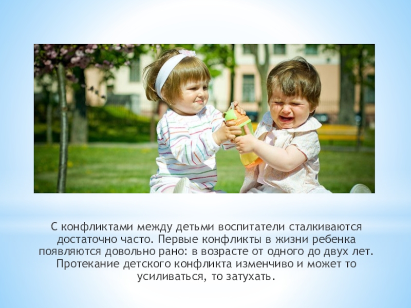 Слайд 3С конфликтами между детьми воспитатели сталкиваются достаточно часто. Первые конфликты в
