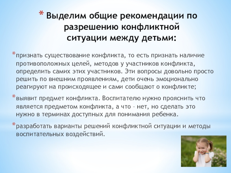 Выделим общие рекомендации по разрешению конфликтной ситуации между детьми:признать существование конфликта, то есть признать наличие противоположных целей,