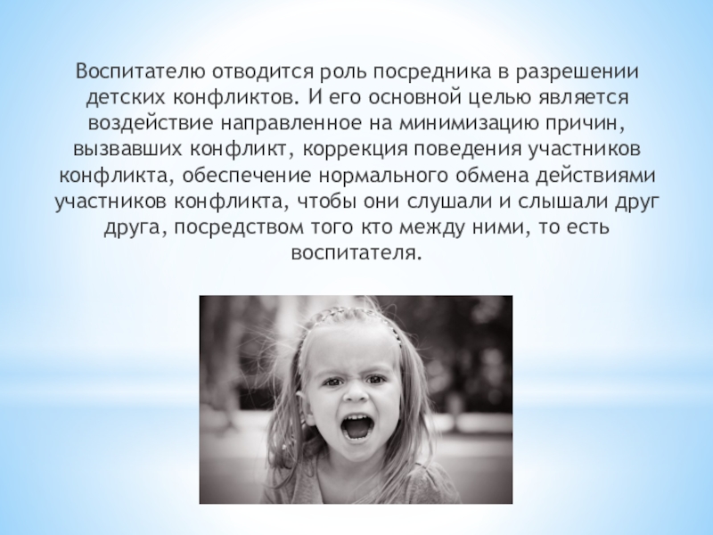 Слайд 10Воспитателю отводится роль посредника в разрешении детских конфликтов. И его основной