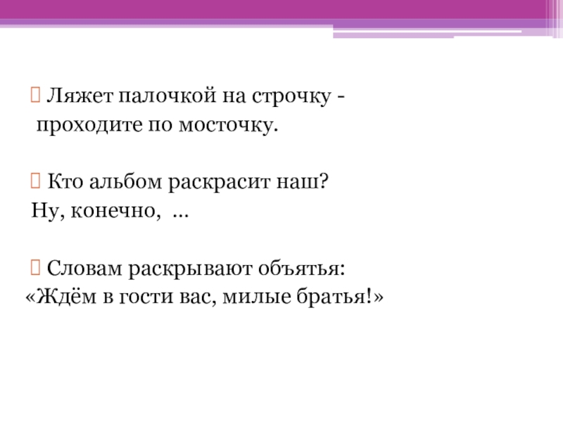 Ляжет палочкой на строчку - проходите по мосточку.Кто альбом раскрасит наш?Ну, конечно, …Словам раскрывают объятья:«Ждём в гости
