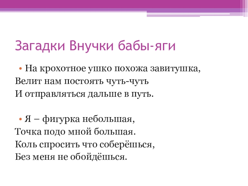 Загадки Внучки бабы-ягиНа крохотное ушко похожа завитушка,Велит нам постоять чуть-чутьИ отправляться дальше в путь.Я – фигурка небольшая,Точка
