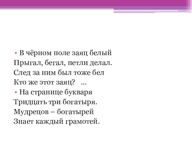 В чёрном поле заяц белыйПрыгал, бегал, петли делал.След за ним был тоже белКто же этот заяц?