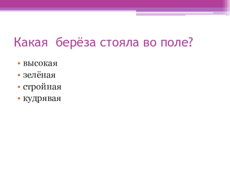 Какая берёза стояла во поле?высокаязелёнаястройнаякудрявая