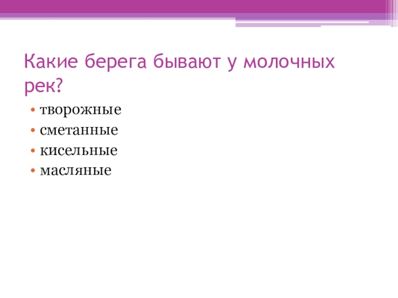 Какие берега бывают у молочных рек?творожныесметанныекисельныемасляные