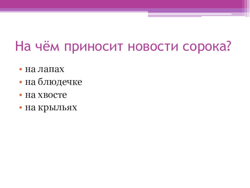 На чём приносит новости сорока?на лапахна блюдечкена хвостена крыльях