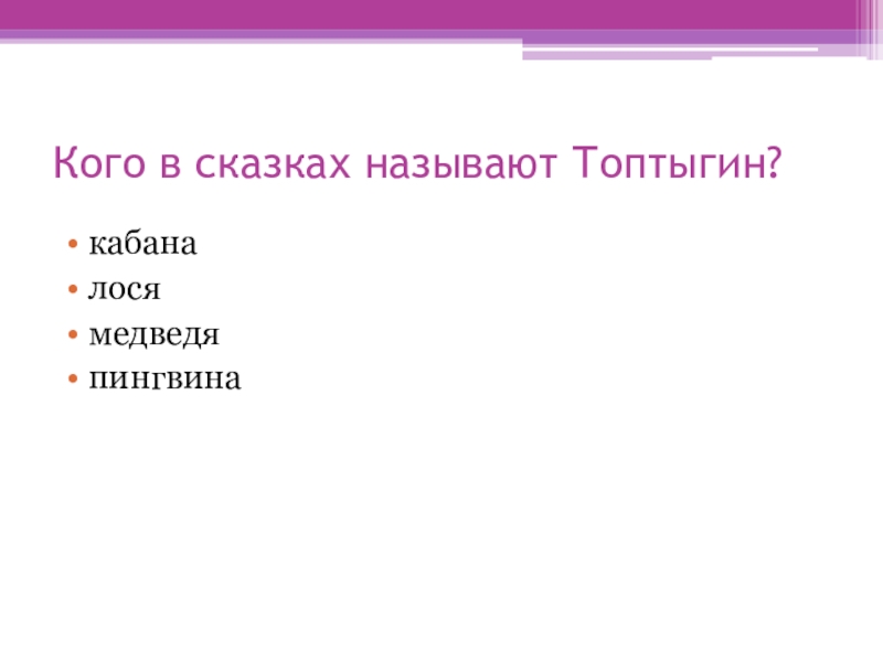 Кого в сказках называют Топтыгин?кабаналосямедведяпингвина