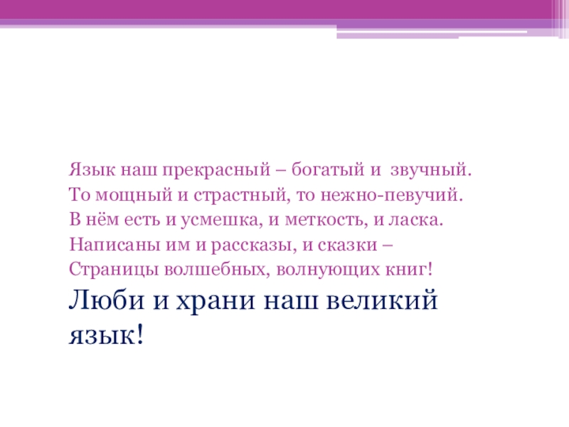 Язык наш прекрасный – богатый и звучный.То мощный и страстный, то нежно-певучий.В нём есть и усмешка, и меткость, и ласка.Написаны им и рассказы, и сказки – Страницы волшебных, волнующих книг!Люби и храни наш великий язык!