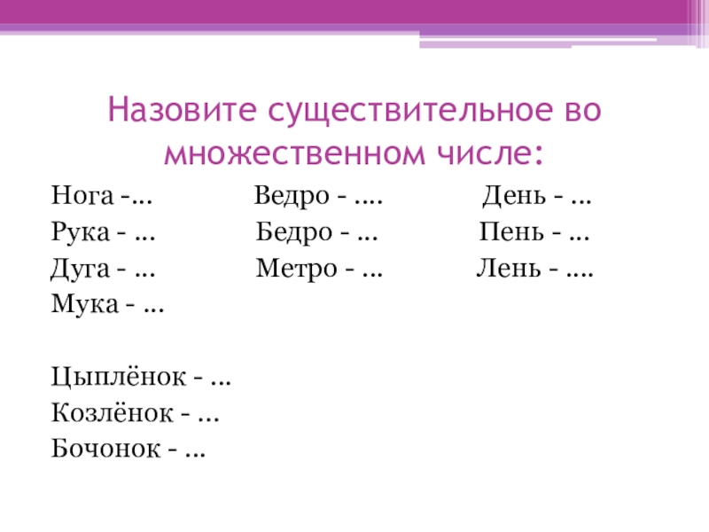 Назовите существительное во множественном числе:Нога -...        Ведро - ....
