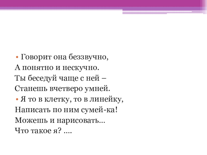 Говорит она беззвучно,А понятно и нескучно.Ты беседуй чаще с ней – Станешь вчетверо умней.Я то в клетку,