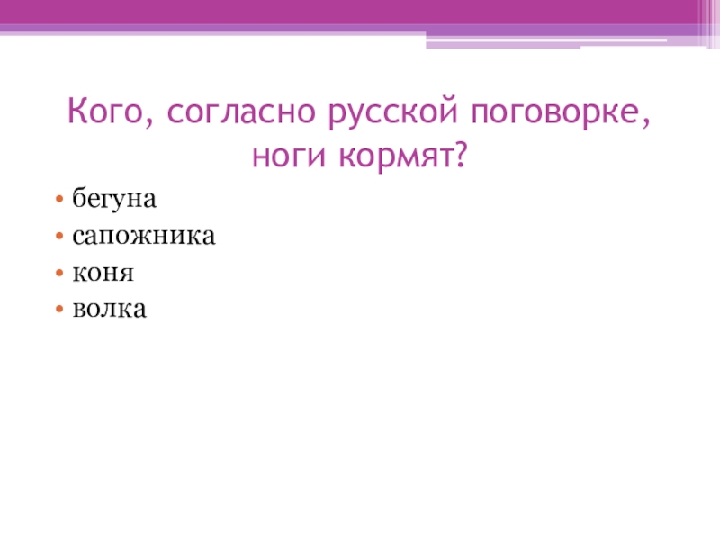 Кого, согласно русской поговорке, ноги кормят?бегунасапожникаконяволка
