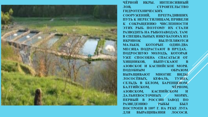 РЫБ И ПРОИЗВОДСТВУ ЧЁРНОЙ ИКРЫ. ИНТЕНСИВНЫЙ ЛОВ, СТРОИТЕЛЬСТВО ГИДРОТЕХНИЧЕСКИХ СООРУЖЕНИЙ, ПРЕГРАДИВШИХ ПУТЬ К НЕРЕСТИЛИЩАМ, ПРИВЕЛИ К СОКРАЩЕНИЮ ЧИСЛЕННОСТИ ЭТИХ РЫБ. ПОЭТОМУ ИХ СТАЛИ РАЗВОДИТЬ НА РЫБОЗАВОДАХ. ТАМ В СПЕЦИАЛЬНЫХ ИНКУБАТОРАХ ИЗ ИКРИНОК ВЫЛУПЛЯЮТСЯ МАЛЬКИ, КОТОРЫЕ ОДИН-ДВА МЕСЯЦА ПОДРАСТАЮТ В ПРУДАХ. ПОДРОСШУЮ МОЛОДЬ, КОТОРАЯ УЖЕ СПОСОБНА СПАСАТЬСЯ ОТ ХИЩНИКОВ, ВЫПУСКАЮТ В АЗОВСКОЕ И КАСПИЙСКОЕ МОРЯ. ПОДОБНЫМ ОБРАЗОМ ВЫРАЩИВАЮТ МНОГИЕ ВИДЫ ЛОСОСЁВЫХ, КЕФАЛЬ, ТУНЦА, СЕЛЬДЬ В БЕЛОМ, БАРЕНЦЕВОМ, БАЛТИЙСКОМ, ЧЁРНОМ, АЗОВСКОМ, КАСПИЙСКОМ И ДАЛЬНЕВОСТОЧНЫХ МОРЯХ. ПЕРВЫЙ В РОССИИ ЗАВОД ПО РАЗВЕДЕНИЮ РЫБЫ БЫЛ ПОСТРОЕН В 1897 Г. НА РЕКЕ ЛУГА ДЛЯ ВЫРАЩИВАНИЯ ЛОСОСЯ.