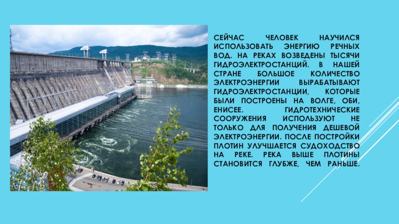 Слайд 4СЕЙЧАС ЧЕЛОВЕК НАУЧИЛСЯ ИСПОЛЬЗОВАТЬ ЭНЕРГИЮ РЕЧНЫХ ВОД. НА РЕКАХ ВОЗВЕДЕНЫ ТЫСЯЧИ
