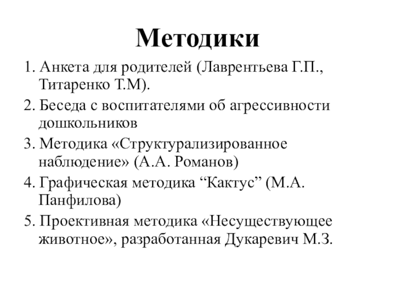 Методики1. Анкета для родителей (Лаврентьева Г.П., Титаренко Т.М).2. Беседа с воспитателями об агрессивности дошкольников3. Методика «Структурализированное наблюдение»