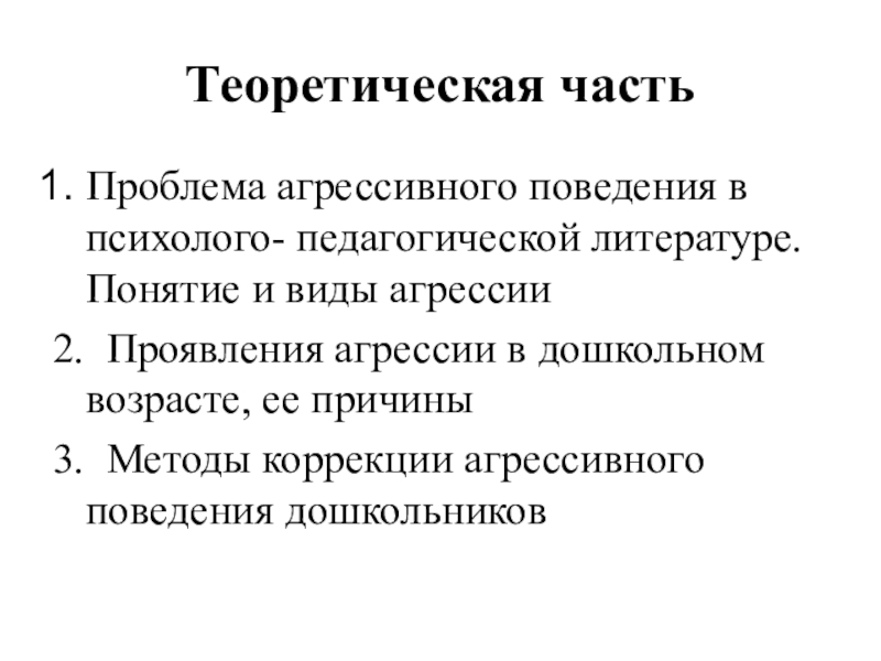 Теоретическая частьПроблема агрессивного поведения в психолого- педагогической литературе. Понятие и виды агрессии2. Проявления агрессии в дошкольном возрасте,