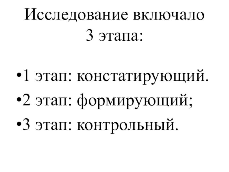 Исследование включало  3 этапа:  1 этап: констатирующий.2 этап: формирующий;3 этап: контрольный.