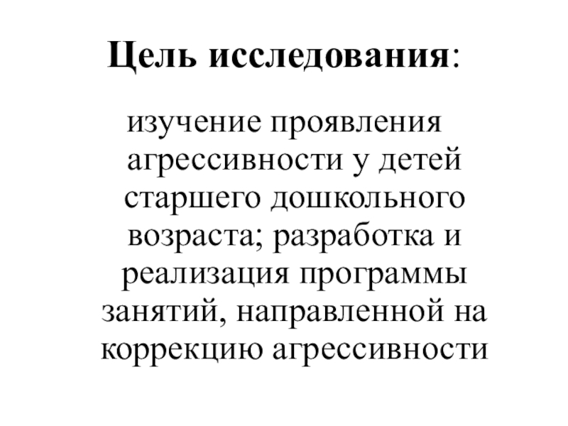 Цель исследования:изучение проявления агрессивности у детей старшего дошкольного возраста; разработка и реализация программы занятий, направленной на коррекцию
