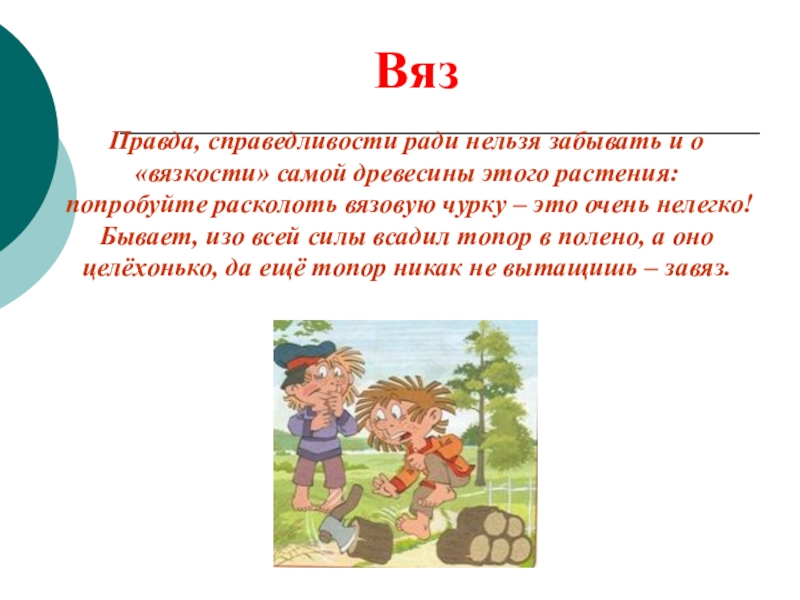 этого растения: попробуйте расколоть вязовую чурку – это очень нелегко! Бывает, изо всей силы всадил топор в полено, а оно целёхонько, да ещё топор никак не вытащишь – завяз.