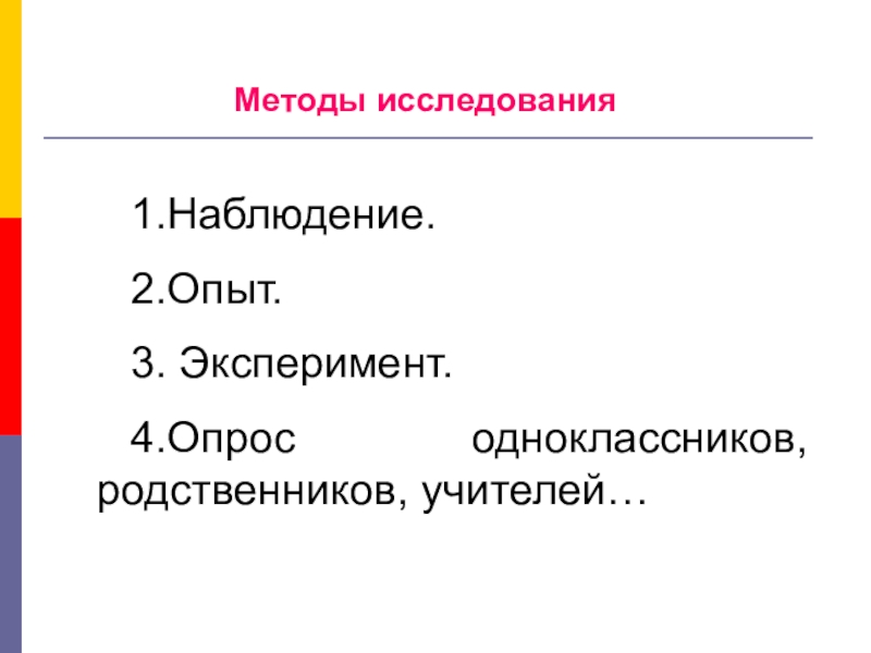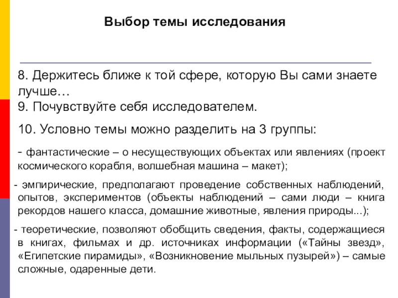 эмпирические, предполагают проведение собственных наблюдений, опытов, экспериментов (объекты наблюдений – сами люди – книга рекордов нашего класса, домашние животные, явления природы...);