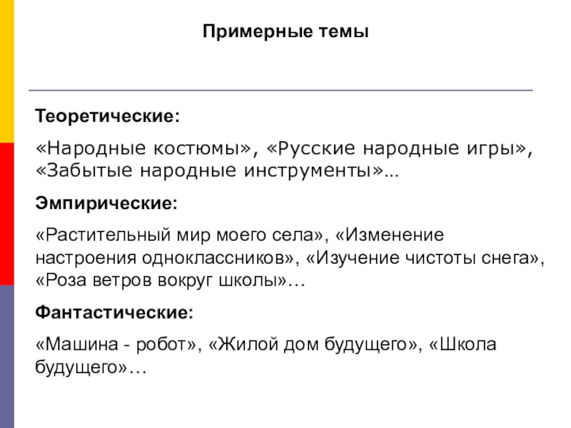 теоретические, позволяют обобщить сведения, факты, содержащиеся в книгах, фильмах и др. источниках информации («Тайны звезд», «Египетские пирамиды», «Возникновение мыльных пузырей») – самые сложные, одаренные дети.