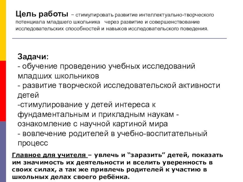 Слайд 3Цель работы – стимулировать развитие интеллектуально-творческого потенциала младшего школьника через