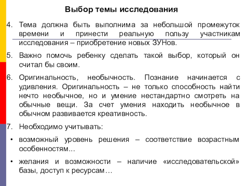 выбор темы исследования (необходимо ограничивать границы исследования);