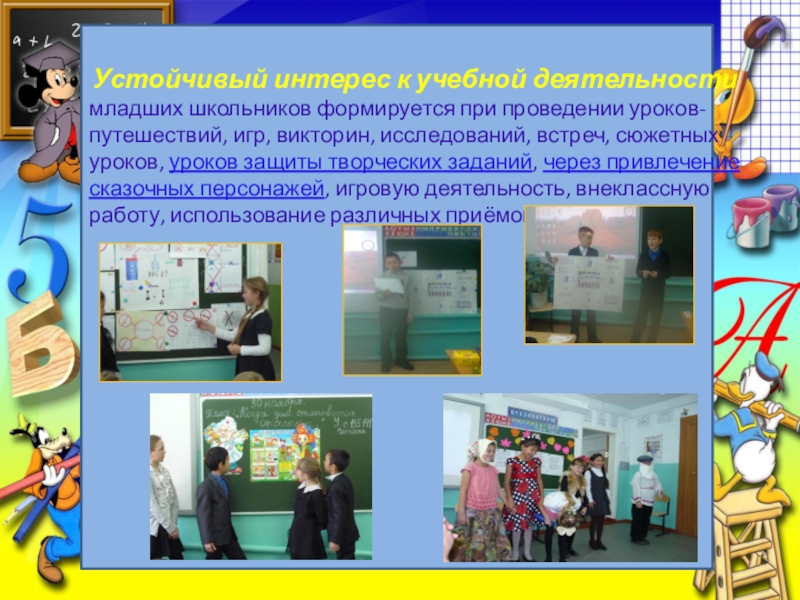 младших школьников формируется при проведении уроков-путешествий, игр, викторин, исследований, встреч, сюжетных уроков, уроков защиты творческих заданий, через привлечение сказочных персонажей, игровую деятельность, внеклассную работу, использование различных приёмов.