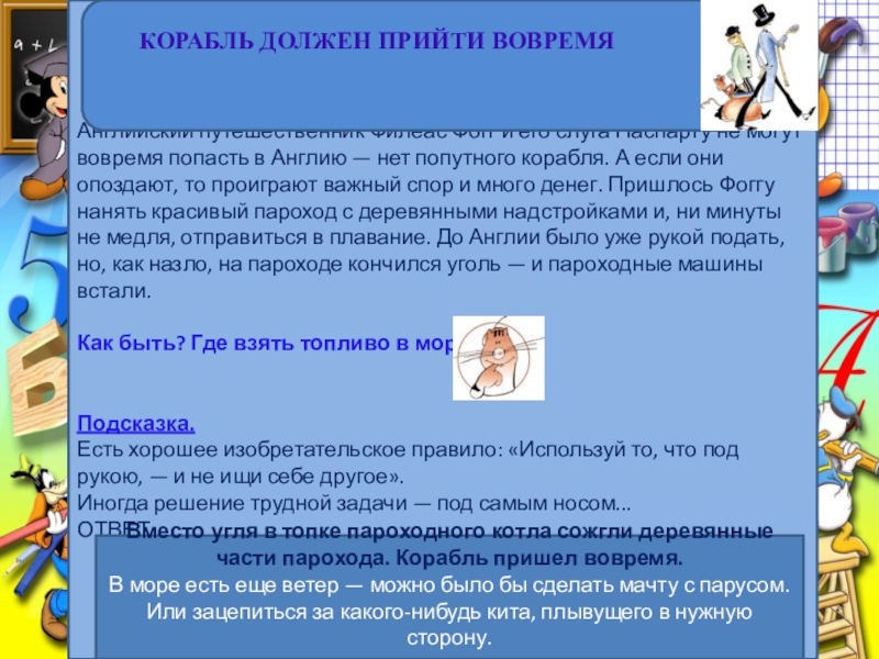 Английский путешественник Филеас Фогг и его слуга Паспарту не могут вовремя попасть в Англию — нет попутного корабля. А если они опоздают, то проиграют важный спор и много денег. Пришлось Фоггу нанять красивый пароход с деревянными надстройками и, ни минуты не медля, отправиться в плавание. До Англии было уже рукой подать, но, как назло, на пароходе кончился уголь — и пароходные машины встали.