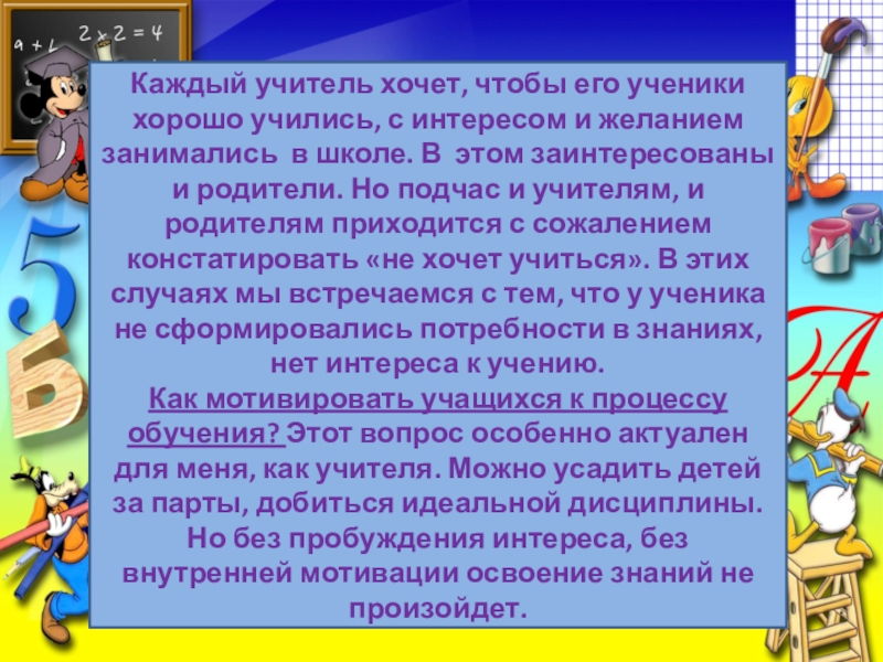 Задача учителя (и весьма непростая) заключается как раз в том, чтобы обеспечить возникновение, сохранение и преобладание в душе школьника именно мотивов учебно-познавательной деятельности.