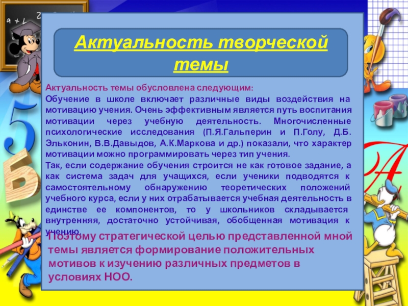 Поэтому стратегической целью представленной мной темы является формирование положительных мотивов к изучению различных предметов в условиях НОО.