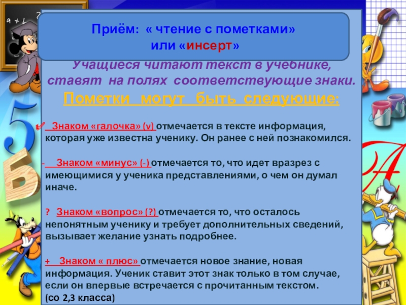 + Знаком « плюс» отмечается новое знание, новая информация. Ученик ставит этот знак только в том случае, если он впервые встречается с прочитанным текстом.