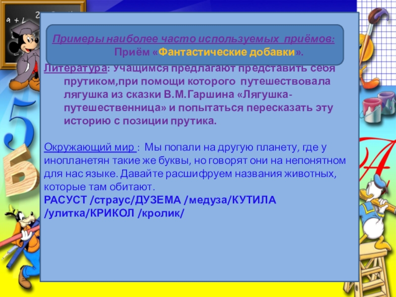 Литература: Учащимся предлагают представить себя прутиком,при помощи которого путешествовала лягушка из сказки В.М.Гаршина «Лягушка-путешественница» и попытаться пересказать эту историю с позиции прутика.