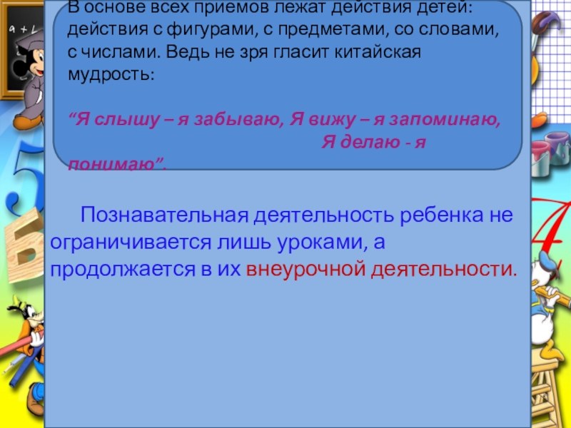 В основе всех приемов лежат действия детей: действия с фигурами, с предметами, со словами, с числами. Ведь не зря гласит китайская мудрость: