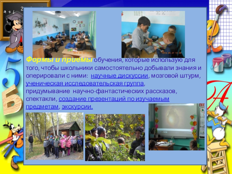 Формы и приемы обучения, которые использую для того, чтобы школьники самостоятельно добывали знания и оперировали с ними: научные дискуссии, мозговой штурм, ученическая исследовательская группа, придумывание научно-фантастических рассказов, спектакли, создание презентаций по изучаемым предметам, экскурсии.