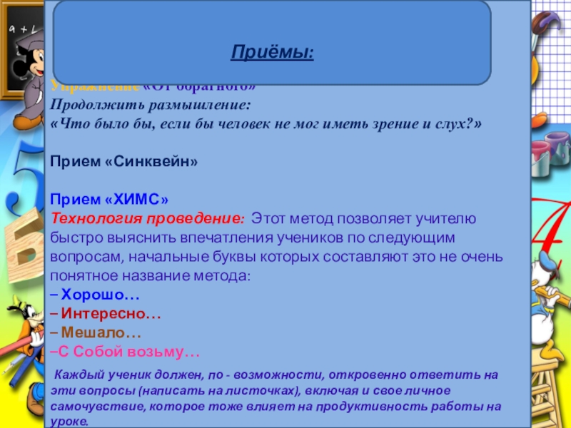 Технология проведение: Этот метод позволяет учителю быстро выяснить впечатления учеников по следующим вопросам, начальные буквы которых составляют это не очень понятное название метода: