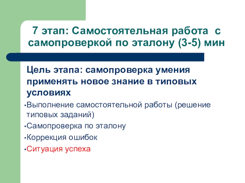 Слайд 157 этап: Самостоятельная работа с самопроверкой по эталону (3-5) мин