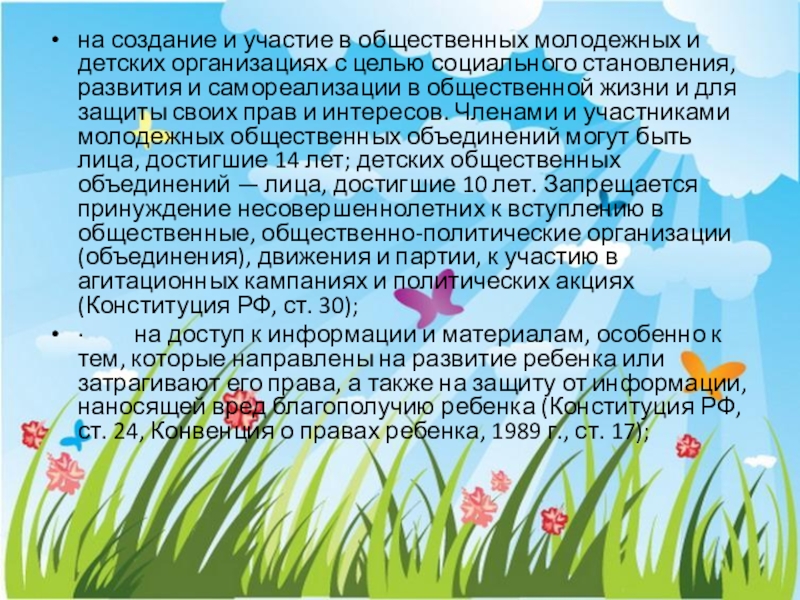 Слайд 9на создание и участие в общественных молодежных и детских организациях с