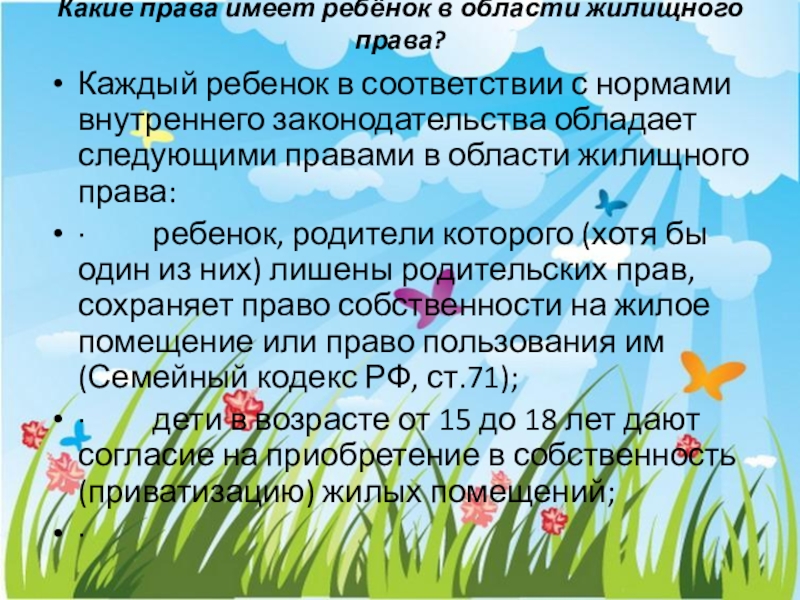 Слайд 13Какие права имеет ребёнок в области жилищного права?