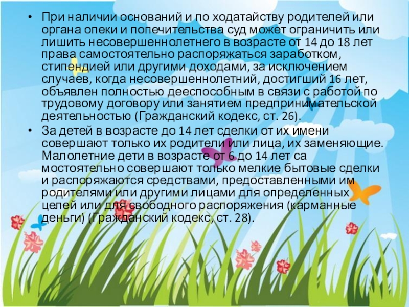 За детей в возрасте до 14 лет сделки от их имени совершают только их родители или лица, их заменяющие. Малолетние дети в возрасте от 6 до 14 лет самостоятельно совершают только мелкие бытовые сделки и распоряжаются средствами, предоставленными им родителями или другими лицами для определенных целей или для свободного распоряжения (карманные деньги) (Гражданский кодекс, ст. 28).