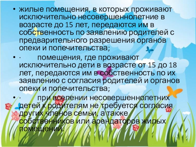 · помещения, где проживают исключительно дети в возрасте от 15 до 18 лет, передаются им в собственность по их заявлению с согласия родителей и органов опеки и попечительства;