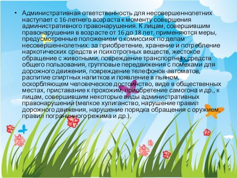 административного правонарушения. К лицам, совершившим правонарушения в возрасте от 16 до 18 лет, применяются меры, предусмотренные положением о комиссиях по делам несовершеннолетних: за приобретение, хранение и потребление наркотических средств и психотропных веществ, жестокое обращение с животными, повреждение транспортных средств общего пользования, групповые передвижения с помехами для дорожного движения, повреждение телефонов-автоматов, распитие спиртных напитков и появление в пьяном, оскорбляющем человеческое достоинство, виде в общественных местах, приставание к прохожим, приобретение самогона и др., к лицам, совершившим некоторые виды административных правонарушений (мелкое хулиганство, нарушение правил дорожного движения, нарушение порядка обращения с оружием, правил пограничного режима и др.).