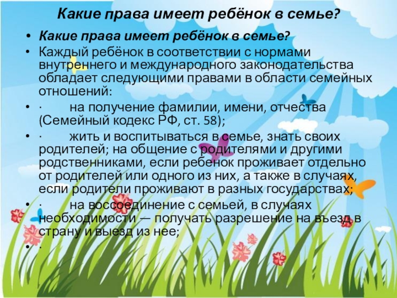 ребёнок в соответствии с нормами внутреннего и международного законодательства обладает следующими правами в области семейных отношений: