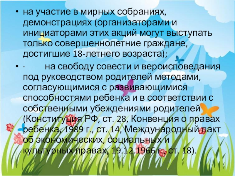 · на свободу совести и вероисповедания под руководством родителей методами, согласующимися с развивающимися способностями ребенка и в соответствии с собственными убеждениями родителей (Конституция РФ, ст. 28, Конвенция о правах ребенка, 1989 г., ст. 14, Международный пакт об экономических, социальных и культурных правах, 19.12.1966 г., ст. 18).
