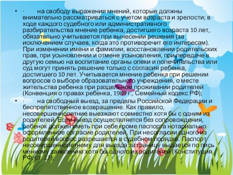 · на свободный выезд, за пределы Российской Федерации и беспрепятственное возвращение. Как правило, несовершеннолетние выезжают совместно хотя бы с одним из родителей. Если выезд осуществляется без сопровождения, ребенок должен иметь при себе кроме паспорта нотариально оформленное согласие родителей. При несогласии одного из родителей вопрос разрешается в судебном порядке. Паспорт несовершеннолетнему для выезда за границу выдается по письменному заявлению хотя бы одного из родителей (Конституция РФ, ст. 27);