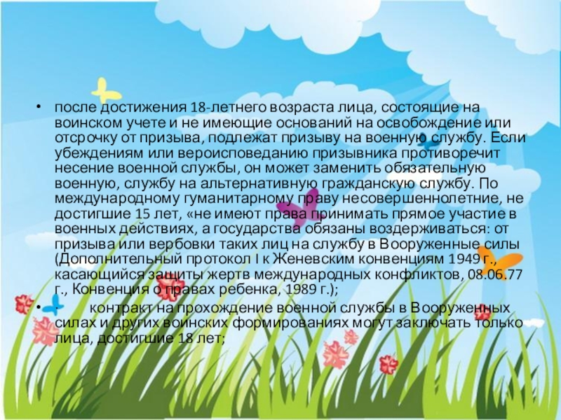 имеющие оснований на освобождение или отсрочку от призыва, подлежат призыву на военную службу. Если убеждениям или вероисповеданию призывника противоречит несение военной службы, он может заменить обязательную военную, службу на альтернативную гражданскую службу. По международному гуманитарному праву несовершеннолетние, не достигшие 15 лет, «не имеют права принимать прямое участие в военных действиях, а государства обязаны воздерживаться: от призыва или вербовки таких лиц на службу в Вооруженные силы (Дополнительный протокол I к Женевским конвенциям 1949 г., касающийся защиты жертв международных конфликтов, 08.06.77 г., Конвенция о правах ребенка, 1989 г.);