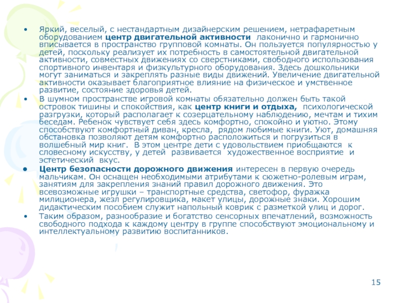 Слайд 15Яркий, веселый, с нестандартным дизайнерским решением, нетрафаретным оборудованием центр двигательной активности