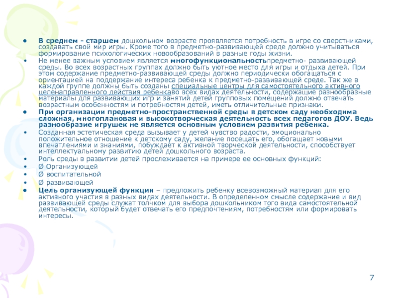 сверстниками, создавать свой мир игры. Кроме того в предметно-развивающей среде должно учитываться формирование психологических новообразований в разные годы жизни.