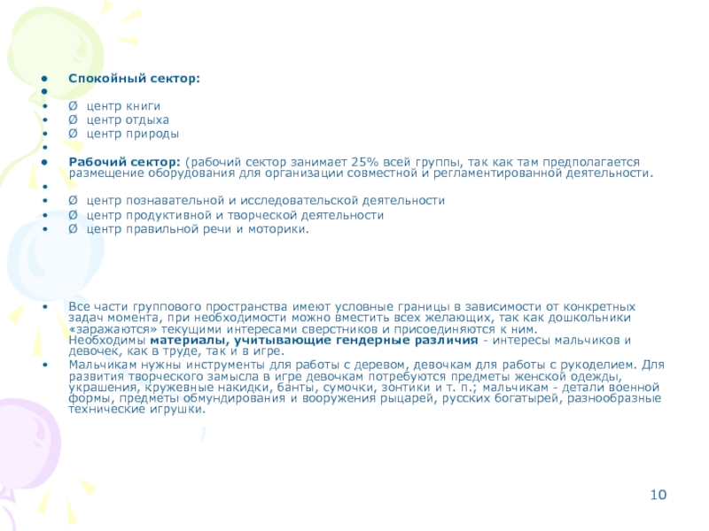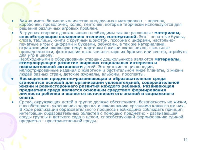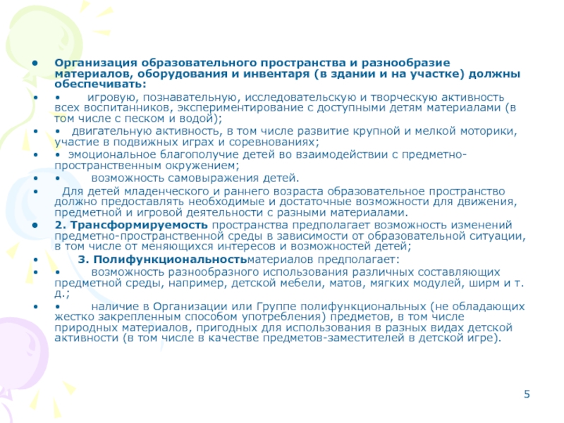 (для игры, конструирования, уединения и пр.), а также разнообразных материалов, игр, игрушек и оборудования, обеспечивающих свободный выбор детей;