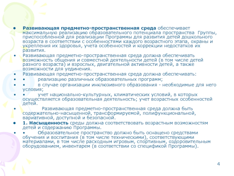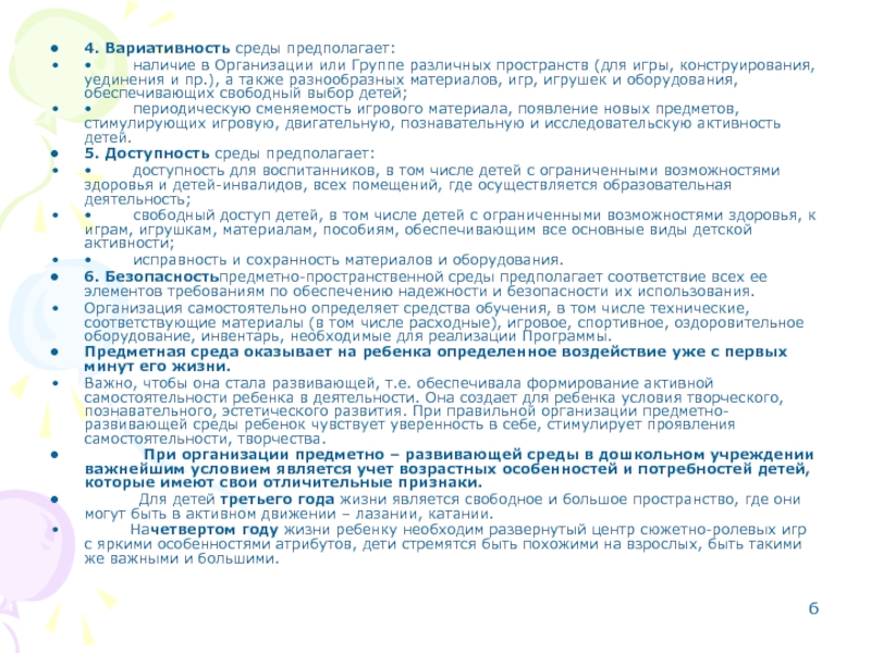Развивающая предметно-пространственная среда должна быть содержательно-насыщенной, трансформируемой, полифункциональной, вариативной, доступной и безопасной.