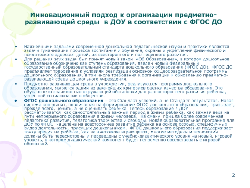 Слайд 2Инновационный подход к организации предметно-развивающей среды в ДОУ в соответствии с