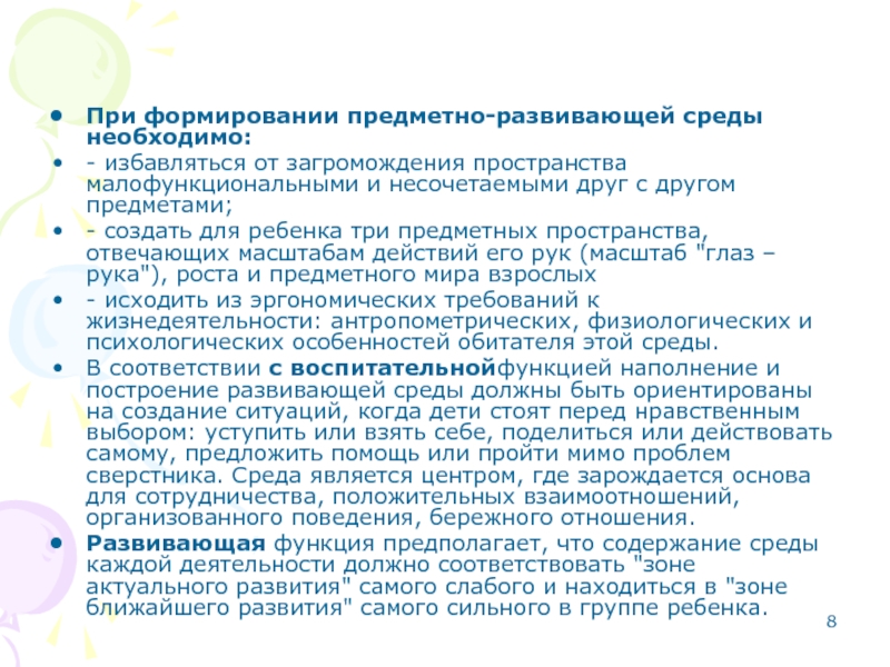 Слайд 8При формировании предметно-развивающей среды необходимо: